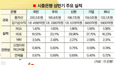 이에 따라 총자산이익률(ROA·총자산 대비 순익비율), 자기자본이익률(ROE·자기자본 대비 순익비율) 등 실적지표 역시 상승세다. 신한은행의 상반기 ROA와 ROE는 각각 1.86%,29.96%. 지난해 말보다 무려 0.90%포인트,13.01%포인트씩 늘어난 수치다. 우리은행 역시 지난해 말 1.13%,15.20%에서 1.60%,23.11%로 높아졌다.