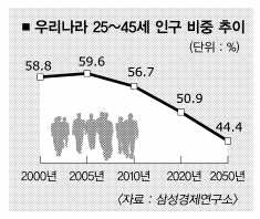 특히 생산가능인구(15∼64세)의 허리격인 25∼45세 비중이 2005년 59.6%를 정점으로 점점 감소할 것으로 내다봤다.2050년에는 25∼45세 비중이 인구 10명당 4.4명으로 줄어드는 반면 50세 이상은 4.1명으로 늘어나 두 연령층의 비중이 비슷해진다는 분석이다.