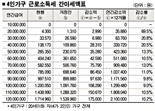 연봉 4000만원인 4인 가구 근로자의 경우 원천징수액은 월 13만 8170원에서 10만 9860원으로 2만 8310원(20.5%) 줄어든다.