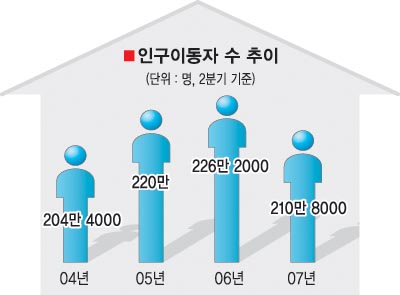 통계청 관계자는 “부동산 경기가 둔화되면서 이사를 미루는 경우가 많아져 인구이동이 준 것으로 보인다.”고 말했다.