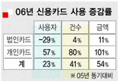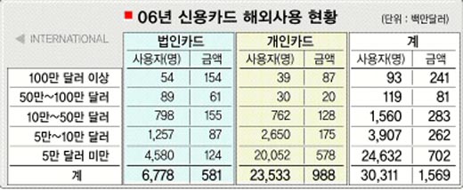 지난해 해외 신용카드 총 사용실적은 705만명에 48억 4200만달러로 전년에 비해 각각 19%,33% 증가했다. 개인들의 고액 사용이 급증했다. 개인은 2만 3533명이 322만 7000건을 사용해 9억 8800만달러를 기록했다. 전년대비 사용자 수는 57%, 건수는 80%, 금액은 무려 2배나 증가한 수치다.