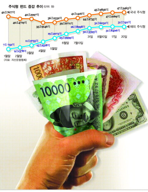 반면 해외펀드로의 자금유입은 줄어들고 있다. 최근 들어 해외펀드 기준가 산정의 오류로 고객들이 피해를 입는 사례가 나타나고 국내 주식시장이 해외 주식시장보다 수익률이 낫기 때문이다.