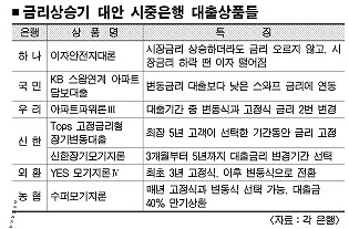 변동금리와 고정금리가 합쳐진 혼합식 주택대출 상품도 금리상승기의 대표적인 대안 상품이다. 우리은행 ‘아파트파워론Ⅲ’를 비롯해 신한 ‘Tops 고정금리형 장기변동대출’·‘신한장기모기지론’, 농협 ‘수퍼모기지론’, 외환 ‘Yes 모기지론Ⅳ’ 등이 있다.