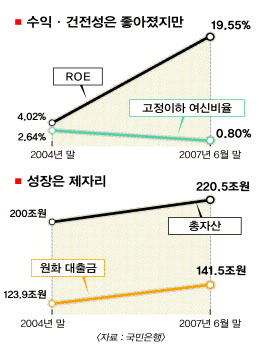 건전성과 수익성을 높이는 대가는 성장의 희생이었다. 총자산은 2004년 말 200조원에서 올 6월말 현재 220조 5000억원으로 20조원 남짓 늘었다.