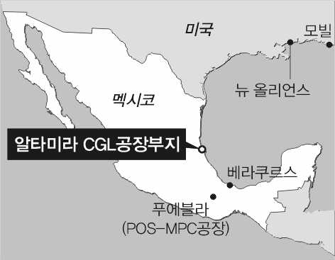 포스코는 6일 멕시코 동부 타마울리파스주 알타미라 항구 부근에 연산 40만t 규모의 자동차용 용융아연도금강판공장(CGL)을 착공했다.2009년 6월 준공될 예정이다. 모두 2억 5000만달러가 투입된다.