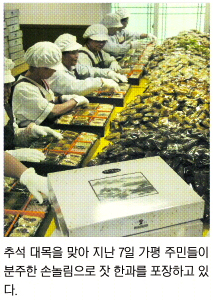 가평군 김옥경씨는 우체국 쇼핑을 통해서만 9000상자의 잣한과를 판다.3억원어치다. 한해 매출이 거의 모두 추석 2주 전부터 10일동안 발생한다. 추석을 앞두고 주문이 밀리다 보니 주민 30명을 아르바이트로 고용해 대목 일손을 충당하고 있다.
