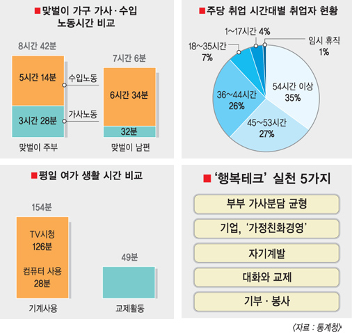아내는 하루 3시간 28분 집안 일을 하는데, 남편은 불과 32분 정도만 하는 맞벌이 부부. 세명 중 한 명꼴로 주당 54시간 이상 일을 해야 하는 근로자. 컴퓨터·TV는 하루 2시간 34분 이상 마주하면서도 가족·친구와의 대화시간은 49분에 불과한 사람들….