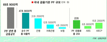 PF란 금융기관이 아파트나 상가 등 특정 프로젝트 자체의 사업성을 보고 장기로 대출하는 금융기법이다. 그러나 최근 PF를 통해 주택시장에 뛰어들었던 중견 건설사들이 미분양 사태로 부도를 맞는가 하면, 건설사가 만기가 된 자산유동화증권(ABS)의 원금상환을 거부하기도 했다. 이 때문에 금융시장에서는 PF발 ‘한국판 서브프라임 모기지 쇼크’를 우려하고 있다.