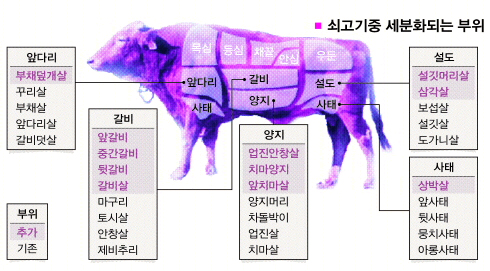농림부는 이같은 고기 부위 명칭 세분화가 가격 인하 효과로도 이어질 것으로 예상했다. 농림부 관계자는 “소 한 마리 중 소비자 선호·고급육 출현 비율이 높아져 전체 부가가치가 상승하면서 생산·유통업자 마진은 늘고 소비자가격은 낮아지는 ‘윈·윈’효과가 나타날 것”이라고 말했다.