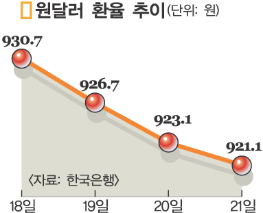 21일 서울 외환시장에서 달러화에 대한 원화 환율은 전날보다 6.10원 급락한 917.00원으로 거래를 시작했다가 922.00원으로 급등하는 등 엎치락뒤치락한 끝에 921.10원으로 마감했다.