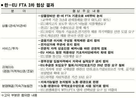 결국 예상대로 한·EU FTA는 한·미 FTA를 기준으로 앞으로 협상이 진전되게 됐다. 우리측으로서는 되도록 늦게 꺼내려던 ‘한·미 FTA’카드를 앞당겨 내놓음으로써 21일 3차 협상을 마무리짓고 다음달 서울에서의 4차 협상에 기대를 걸고 있다.