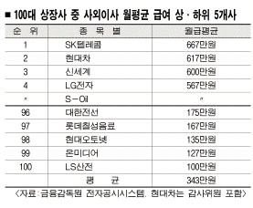 한편 100대기업 상위 20개사 사외이사 월평균 급여는 526만원으로 하위 20개사 월평균치 190만원의 2.8배에 달해 상하위간의 급여 차가 컸다.