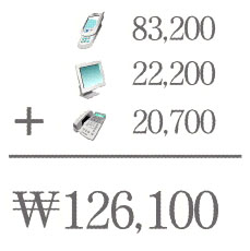 통신비 가운데 휴대전화 요금이 8만 3200원(66%)으로 가장 많았다. 유선인터넷 2만 2200원(17.6%), 유선전화 2만 700원(16.4%)으로 나타났다.