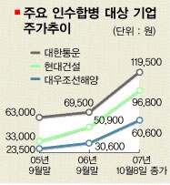 대한통운은 2005년 9월 말 6만 3000원이던 주가가 8일 11만 9500원으로 올랐다. 대우조선해양은 같은 기간 2만 3500원에서 6만 600원으로 2.6배, 쌍용건설은 9200원에서 2만 4500원으로 2.7배가 됐다.