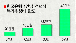 선택적 복리후생비가 급증한 것은 한은이 연간 사용 한도를 지난해 1인당 60만원에서 올해 140만원으로 두배 이상 늘렸기 때문이다. 한은의 1인당 선택적 복리후생비 한도는 2004년 20만원에서 2005년 40만원, 지난해 60만원 등으로 매년 늘어나고 있다.