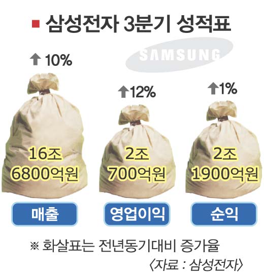 삼성전자는 12일 이같은 내용의 3분기 실적(본사 기준)을 발표했다. 매출 16조 6800억원, 영업이익 2조 700억원, 순익 2조 1900억원이다.