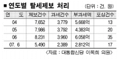 국세청은 이같은 제보를 근거로 지난 4년간 1만 3920건에 대해 과세했다. 그 결과 국세청이 추징한 액수는 2004년 5668억원을 시작으로 2005년 4383억원,2006년 6058억원,2007년 6월 현재 2812억원 등 모두 1조 8921억원에 달한다.
