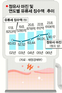 이런 가운데 정부가 지난 5년간 거둬들인 기름 관련 세금은 해마다 1조원 이상씩 늘어 104조원에 이른다. 연도별 유류세 징수액은 2002년 17조 8253억원,2003년 19조 5285억원,2004년 20조 8718억원,2005년 22조 612억원,2006년 23조 6106억원 등이 걷혔다.