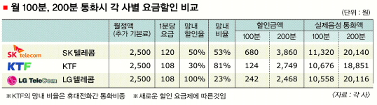 한달에 100분을 통화하는 소비자의 경우 SKT는 680원(10초당 20원, 망내(網內)통화비중 53%),LGT는 242원(10초당 18원, 망내통화비중 23%),KTF는 124원(10초당 18원, 휴대전화간 통화비중 81%)을 할인받는다. 같은 방식으로 200분의 경우,SKT는 3860원,KTF 2749원,LGT 2468원을 절감할 수 있다.