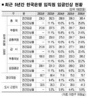 이날 국감에서 공개된 한은의 인건비는 2003년 1552억원에서 2004년 1712억원,2005년 1818억원,2006년 1962억원에 이어 올해 2122억원으로 늘었다. 적자 기간에도 10% 정도 신장세를 계속한 셈이다.
