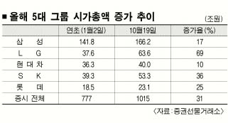 올 들어 LG와 SK그룹 시가총액이 크게 늘어난 반면 삼성과 현대차그룹은 상대적으로 주춤했다.