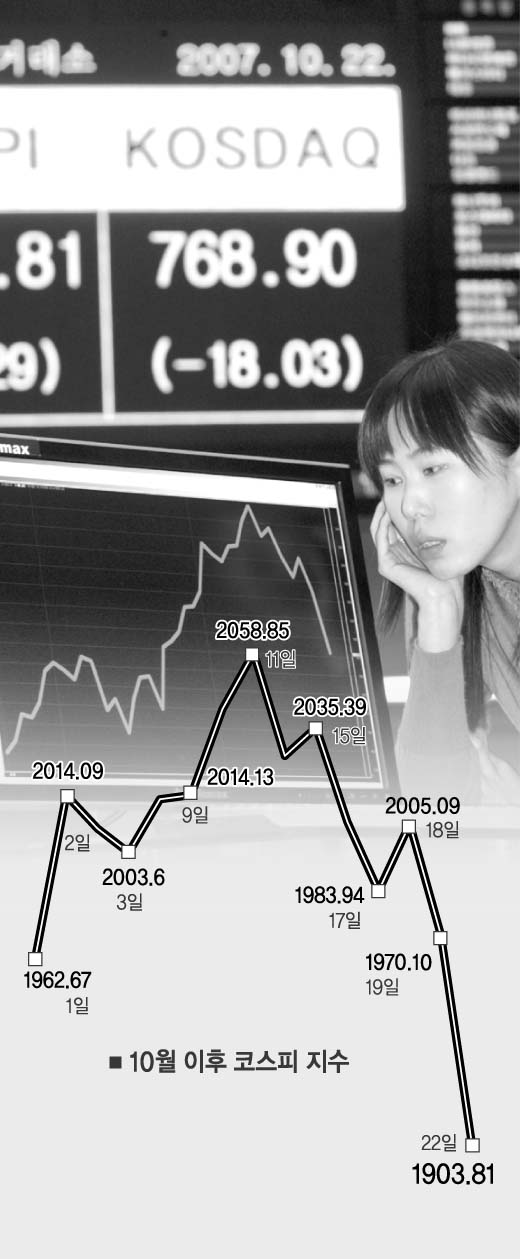 22일은 예상대로 ‘블랙 먼데이’를 면치 못했다. 그러나 1900선을 지켜냈다는 점에서 전문가들은 안도의 한숨을 내쉰다. 지난주부터 투신권으로 들어오기 시작한 자금이 버팀목을 한 셈이다.