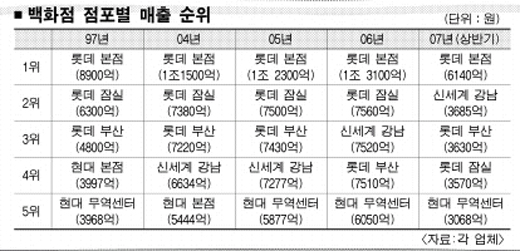 매출 절대액은 물론 매출액 5위중 신장률에서도 업계 1위인 롯데 본점이 최고다. 전년 대비 2006년 매출 신장률은 롯데 본점이 6.5%로 높은 편이다. 이어 신세계 강남점(3.3%), 현대 무역점(2.9%), 롯데 부산점(1.1%), 롯데 잠실점(0.8%) 등 순이다.6000억원 이상 매출을 가진 백화점의 매출 신장률이 평균 1∼2% 수준임을 감안할 때 롯데 본점의 신장률은 의미가 있다는 평가를 받는다.