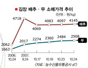 무엇보다 공급 부족의 심화로 배추·무의 지속적인 가격 상승이 우려된다. 농산물품질관리원에 따르면 올해 배추와 무의 재배 면적은 각각 1만 2178㏊,7162㏊로 집계됐다. 이는 지난해보다 각각 15.2%,26.6% 줄었다. 파종기 잦은 비와 태풍으로 제대로 자라기도 전에 죽은 경우가 많기 때문이다. 농림부 관계자는 “절약한다 해도 김장 비용이 지난해보다 30% 이상 더 들 것으로 예상된다.”고 말했다.