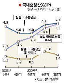 한국은행이 25일 발표한 ‘3분기 실질 국내총생산(속보)’에 따르면 국내총생산(GDP)은 전년동기보다 5.2% 증가율로 2분기 5.0%에 이어 연속 2분기 5% 성장률을 기록했다. 전기와 비교할 때 1.4% 증가한 것으로 2분기의 1.8% 성장에는 못미치지만 탄탄한 성장세를 나타내는 것이다. 국민들의 주머니 사정을 나타내는 실질 국내총소득(GNI)은 전년 동기보다 5.1%로 크게 개선되며 GDP성장률과 흐름을 같이했다.