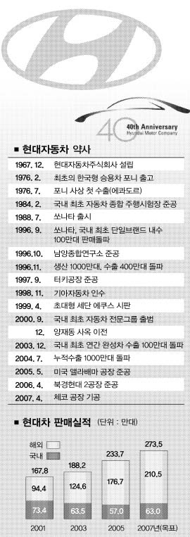 현대차는 갈수록 높아지는 해외판매 비중에 맞춰 미국·중국·인도·터키 공장에 이어 체코공장을 짓는 등 글로벌 생산기지를 빠르게 늘려가고 있다. 지난해 96만대 수준이었던 해외 생산이 2009년부터 190만대로 늘어난다. 러시아·중남미 등으로도 생산기지를 확대할 계획이다. 하이브리드·수소 등 미래 친환경 자동차 개발에도 대규모 투자를 계속하고 있다.