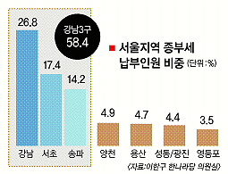 특히 이들 가운데 58.44%인 10만 844명은 강남·서초·송파 등 강남 3개구에 사는 것으로 나타났다. 이들 ‘강남 3구’ 부동산 부자들이 낸 종부세 금액은 우리나라 전체 종부세(개인부문) 금액의 42.6%를 차지했다.