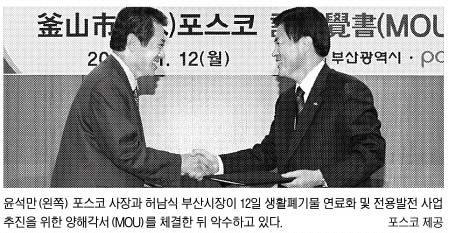 포스코는 12일 부산시와 생활폐기물 연료화 및 전용발전 사업 추진을 위한 양해각서(MOU)를 체결했다. 단순 매립, 소각되던 가연성(可燃性) 생활폐기물을 재활용해 전기를 만드는 사업이다. 이 사업에는 모두 1800억원이 투자될 예정이다. 사업비는 포스코 외에 정부와 부산시의 지원으로 마련된다. 구체적인 각 기관별 분담금은 협의 중이다.