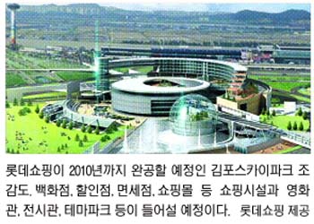 롯데는 14일 김포 스카이파크 기공식을 갖는다. 쇼핑, 호텔 등 그룹 10개 계열사가 참여해 동북아시대 롯데를 상징하는 타운을 조성한다는 계획이다. 백화점, 할인점, 극장, 놀이공원 등으로 이뤄진다. 총 19만 4877㎡ 부지에 연면적 31만 4109㎡나 되는 지하 5층∼지상 9층짜리 건물이다. 녹지 비중은 70%다. 야외 조경면적이 국내 유통시설 최대 규모인 13만 249㎡이다.