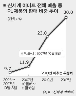신세계 이마트의 자사 브랜드(PL)제품이 출시된 지 꼭 한달이 됐다.PL제품은 현재 꾸준한 판매 호조세를 이어가고 있다. 반면 골든존(눈에 가장 잘 띄는 판매대)이 PL로 도배되는 등 제조업체와의 상생은 외면하고 자기 배만 불리고 있다는 비판이 들끓고 있다.●이마트,2012년이면 울트라 ‘영갑’(영원한 갑)으로 등극