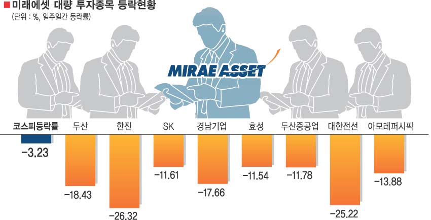 올 들어 미래에셋자산운용이 대량(5%) 보유했다고 밝힌 21개 종목은 지난 일주일간 평균 9.56% 떨어졌다. 같은 기간 동안 코스피 하락률 3.23%의 3배 수준이다. 종목별로 보면 한진이 26.32%, 대한전선이 25.22%, 두산이 18.43%씩 떨어졌다. 미래에셋 펀드 수익률에 적신호가 켜졌다.