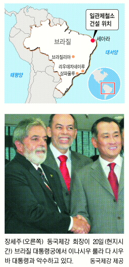 동국제강은 20일(현지시간) 브라질 대통령궁에서 이나시우 룰라 다 시우바 대통령과 장세주 회장 등이 참석한 가운데 세계 최대 철광석 공급사인 CVRD와 일관제철소 건설 및 철광석 공급에 관한 양해각서(MOU)를 체결했다고 21일 밝혔다.