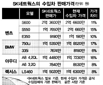 SK네트웍스는 22일 서울 방배동과 경기도 분당에 직수입 전문 매장을 열고 벤츠,BMW, 아우디, 렉서스, 도요타 캠리 등 5개 브랜드 차량의 판매를 시작했다. 판매모델은 ▲벤츠 3종(S600,S550,E350) ▲BMW 3종(750Li,535i,335i) ▲아우디 2종(A8 4.2QL,A6 3.2Q) ▲렉서스 1종(LS460) ▲도요타 캠리 1종(3.5V6) 등 총 10개다.