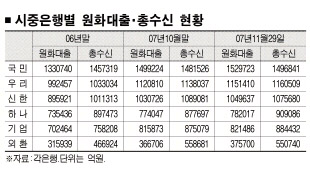반면 하나은행은 정기예금 특판 호조 등으로 총수신을 3조 1389억원(3.6%)이나 늘린 덕분에 총수신과의 격차를 10월 말 10조 3650억원에서 지난달 29일 12조 7069억원으로 늘렸다. 이밖에 기업은행은 5조 9206억원에서 6조 2946억원, 외환은 19조 1975억원에서 17조 5040억원의 차이를 유지했다.