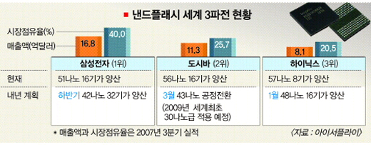 하이닉스반도체의 역공이 시작됐다. 내년 1월 세계 최초로 40나노급 낸드플래시(전원이 꺼져도 데이터가 저장되는 비휘발성 메모리) 반도체 생산에 들어간다. 이 분야 세계 1·2위인 삼성전자·도시바와의 본격 3파전 서막이 올랐다.