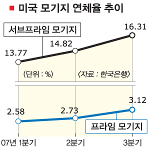 미국의 지난 3·4분기 전체 모기지 연체율은 5.59%로 지난 1986년 이후 최고치를 기록했다. 프라임 모기지(우량주택담보대출) 연체율은 지난 1분기 2.58%에서 3.12%로, 서브프라임 모기지는 13.77%에서 16.31%로 각각 높아졌다. 전체 모기지 가운데 주택 차압이 이뤄진 모기지 비중도 올 3분기 0.78%로 사상 최고치를 기록했다.