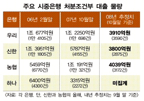 금융감독원에 따르면 올 하반기 만기가 되는 처분조건부 대출은 1만 4715건 1조 9000억여원. 내년 처분조건부 등 조건부대출은 2만 3602건 2조 4000억원으로 늘어난다. 2008년 은행별 처분조건부 대출 예상치는 우리은행 3590건 3910억원을 비롯해 ▲신한 2875건 3800억원 ▲농협 3172건 4039억원 등이다. 그러나 이는 대부분 지난 9월 기준 추정치인 만큼, 실제 규모는 이보다 크다.