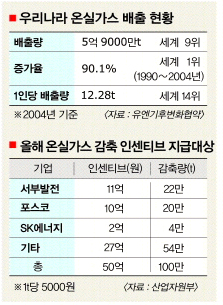 정부는 내년에 온실가스 감축 목표치를 정하더라도 각 기업에 이를 할당하지는 않을 방침이다. 대신 인센티브를 통해 자율 감축을 최대한 유도한다는 계획이다.‘채찍’보다는 ‘당근’ 정책이다. 정부는 포스코·한국서부발전·SK 등 40개 기업에 다음주쯤 총 50억원의 인센티브를 지급한다. 올초 온실가스를 1t 줄이면 5000원씩 주겠다고 약속한 데 따른 것이다.