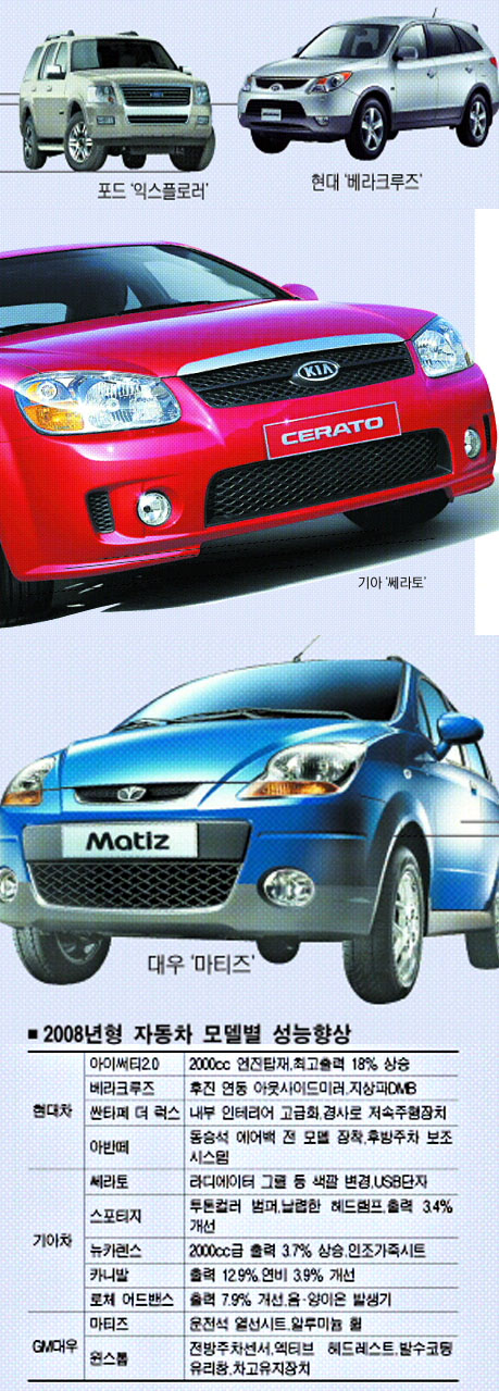 자동차 업계가 연말을 맞아 2008년형 모델을 잇따라 출시하고 있다. 성능과 디자인, 안전·편의시설 등에서 여느 해보다 다양한 ‘새 단장’이 이뤄졌다. 부쩍 높아진 소비자들의 안목과 기대치에 부응하기 위해서다.