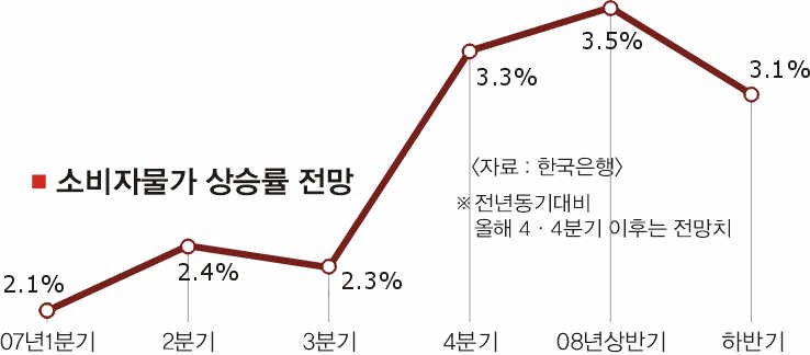 이에 따라 소비자물가는 10월 3.0%,11월 3.5% 등 가파른 상승세에 있다. 한국은행의 내년 상반기 소비자물가 상승률 전망치는 3.5%지만 지금 같은 추세라면 예상을 넘어설 가능성도 배제할 수 없다.