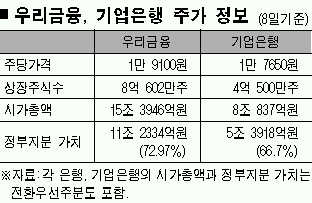 일단 금융권에서는 이들 금융기관의 민영화를 위해서는 국민연금 등 연·기금의 역할이 불가피하다고 보고 있다. 우리금융과 기업은행의 현재 시가총액은 각각 15조 4000억원,8조 840억원 정도. 여기서 경영권을 행사할 수 있는 주식지분 50%+1주의 가격은 각각 9조원,5조원 정도다. 국민연금의 지난해 투자가능 금액은 계약분까지 포함해 모두 16조 5000억여원. 일부 대기업을 제외하고 이들 기관을 인수할 수 있는 국내 자본은 국민연금이 유일하다.