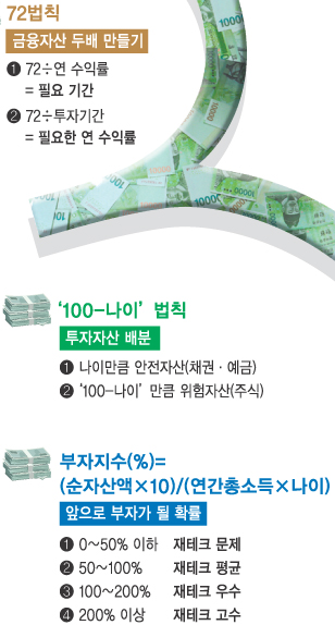 부자지수를 계산하기 위해 자신의 자산과 부채상태를 따져봐야 한다. 자신의 재무상태 전반을 점검해볼 수 있는 좋은 기회다. 부자지수가 낮다면? 자신의 씀씀이와 투자현황을 점검해보고 72법칙과 ‘100-나이’법칙을 자신에게 맞게 운용, 돈을 모아야 한다.
