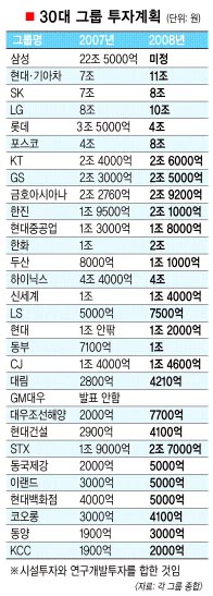 30대그룹 중 지난해보다 투자를 줄이는 그룹은 하이닉스(4조 4000억에서 4조원)가 유일했다.