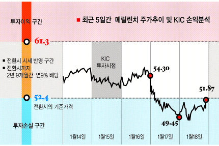 KIC가 기준가로 정한 52.4달러는 메릴린치의 지난 9·10·11일 주가를 평균한 가격이다. 당시만 해도 사상 최저수준이라고 할 수 있었다. 그러나 17일 주가는 49달러 대로 떨어졌고, 다소 주가가 상승한 18일에도 장중에 47.50달러까지 하락하기도 했다. 특히 미국 서브프라임모기지 부실이 확대되는 상황이기 때문에 현재가 메릴린치 주식의 최저점이라고 장담할 자신이 없다는 것이다. 즉 전환가격 61.3달러가 너무 비싸다는 지적이다.