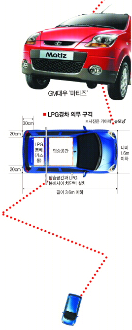 LPG 경차를 만들려면 작은 몸체에 LPG 봄베(가스통)를 장착할 수 있도록 차체를 개조해야 한다. 현행 자동차관리법상 LPG 차량의 봄베는 안전성을 위해 차의 후미(범퍼 포함)로부터 30㎝, 차체 왼쪽 끝·오른쪽 끝으로부터 각각 20㎝씩 공간을 띄우고 설치해야 한다. 탑승공간과 LPG 봄베 사이를 차단하는 격벽(隔壁)도 만들어야 한다. 그러다 보니 경차 차체기준(길이 3.6m, 너비 1.6m, 높이 2.0m 이하)을 충족시키면서 LPG형으로 만드는 것이 쉽지 않다. 지금까지 없던 소형 LPG 엔진도 새로 개발해야 한다. 현재 기아차의 경우 2000㏄·2700㏄급(로체·오피러스·카렌스·카니발 등) 외에는 상용화된 소형 LPG 엔진이 없다.