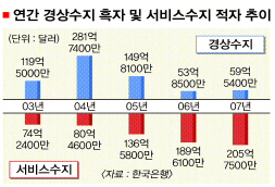 유학 등 해외여행이 급증하면서 지난해 서비스수지 적자 규모가 200억달러를 넘어 사상 최고치를 기록했다. 연간 경상수지 흑자 규모는 수출 호조로 전년보다 15억달러 늘어난 59억달러였다. 외환위기 이후 10년간 흑자기조를 유지했다. 그러나 지난해 12월 경상수지는 8억 1000만달러 적자로, 올해 경상수지 관리에 부담이 될 전망이다. 서비스수지 적자를 메워주던 상품수지가 7억 9660만달러 적자를 나타냈기 때문이다.